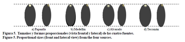 Análisis estadístico. Las estadísticas descriptivas (media, desviación estándar (σ), coeficiente de variación (CV), mínimo y máximo, coeficiente de asimetría y percentiles 25 y 75%) de los pesos y las tallas (longitud, ancho y espesor) se realizaron por sitio y año de recolecta. Para Papantla, Medellín y Tecomán se estudiaron las recolectas de dos años. Las diferencias de medias entre los parámetros de cada fuente se compararon estadísticamente mediante análisis de varianza de una vía (ANDEVAs). Las comparaciones post-hoc se realizaron a parámetros normalizados mediante pruebas de Tukey con un nivel de confianza de 95%. Las relaciones entre tallas y pesos se evaluaron mediante análisis de correlaciones (r) y ANDEVAs de una vía contra valores críticos de F.