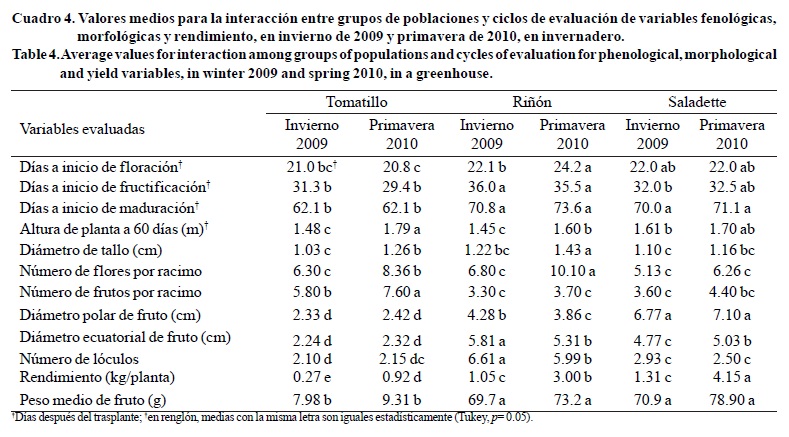 En la interacción de grupos de poblaciones (acervos) y ciclos de cultivo, encontró que los caracteres de días a inicio de floración, fructificación y maduración de frutos se mantienen constantes de ciclo a otro; esto es, las colectas con frutos tipo tomatillo se mantienen precoces en relación a los tipos riñón y saladette que se mantienen como tardíos. En los caracteres de altura de planta, diámetro de tallo, número de flores y frutos por racimo, rendimiento por planta y peso medio de fruto, se determinó un incremento significativo en la estación de primavera en relación a la estación de invierno en los tres grupos de colectas (Cuadro 4).