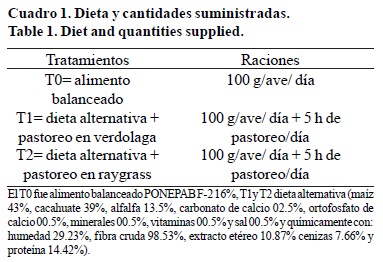 El estudio se realizó en el Módulo de Agricultura Alternativa del Instituto Tecnológico del Valle de Oaxaca (ITVO) que se encuentra ubicado a 17° 00' de latitud norte y 96° 46' de longitud oeste, a una altura de 1 650 m sobre el nivel del mar msnm. Para alimentar a las aves se utilizó alimento comercial balanceado, dieta alternativa más pastoreo en Portulaca oleracea L. (verdolaga) y dieta alternativas más pastoreo en Lolium perenne (raygrass) (Cuadro 1). La población estuvo conformada por 30 gallinas criollas de 64 semanas de edad que terminaron su ciclo de postura.