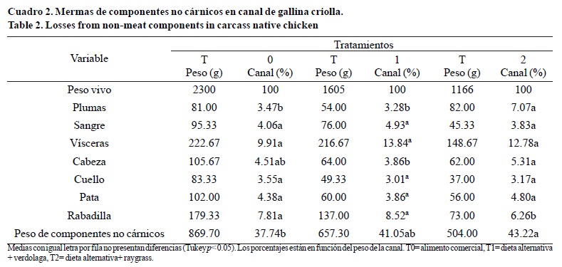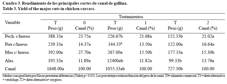 Similares resultados reportan Dou et al. (2009) en pollos de lento crecimiento, las aves que tuvieron acceso a forraje durante el estudio, presentaron igual peso porcentual de canales evisceradas y en los cortes de pechuga que los tratamientos testigo. Igual que en guajolotes, tratados con alimento comercial para pavos fueron más pesados y porcentualmente, presentaron mayor ventaja los tratamientos que tuvieron acceso a forraje verde (Camacho et al., 2011). Los bajos rendimientos productivos de la avicultura familiar pueden atribuirse al sistema de crianza, el cual se caracteriza por el uso de instalaciones rústicas, falta de control sanitario y alimentación deficiente, lo que resulta en una baja producción de carne y huevo.