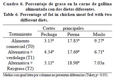 En grasa estadísticamente no se encontró diferencia en el efecto de la dieta alternativa más pastoreo en verdolaga y de la dieta alternativa más pastoreo en raygrass sobre la concentración de grasa en cada uno de los cortes (Cuadro 6). Sin embargo, los valores más altos de grasa numéricamente se encontraron en la pierna de los tres tratamientos aunque entre ellos no existió diferencia.