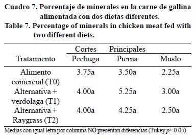 En el contenido de minerales (Cuadro 7) no se encontró diferencia significativa, tanto en las dos dietas alternativas como en el T0. Sin embargo, en T1 fue el que obtuvo la mayor concentración por encima de T0 y T2, no obstante, en pollos Broiles criados bajo condiciones de pastoreo en Ischaemun ciliare (Ratana) se reporta un porcentaje ceniza de 1.32% y 0.98% (Vargas, 2001). Y en guajolotes criollos de 64 semanas de edad alimentados con maíz y soya valores son de 0.58 para pechuga, de 0.54 para pierna y de 0.59 para el muslo (López et al., 2009). Lo revelado en este estudio en cuanto a minerales es alto de acuerdo a los que la literatura reporta; sin embargo, Lloyd et al. (1982) reportan que el contenido de ceniza para un animal adulto es 4%.