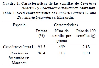 El material vegetal fueron semillas de Cenchrus ciliaris L. proporcionadas por el Colegio de Postgraduados, Campus Montecillo, que tenían un año de almacenamiento a temperatura ambiente y semillas de Brachiaria brizatha cv. Marandu que se adquirieron en una empresa comercializadora de semillas. Las principales características de ambas especies se resumen en el Cuadro 1.