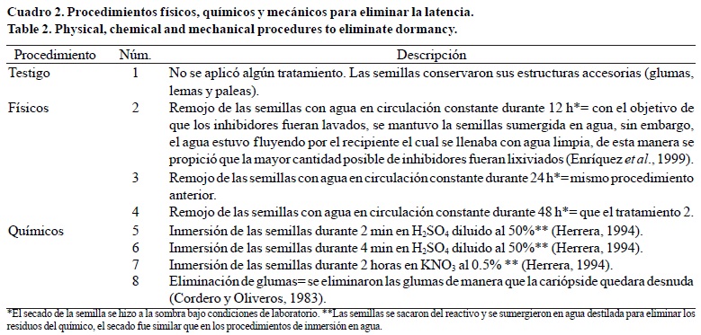 De Cenchrus ciliaris L. un total de 1 600 se separaron en ocho grupos de 200 semillas, para someterlas a procedimientos físicos, químicos y mecánicos para evaluar su efecto sobre la germinación, además se contó con un grupo testigo. En Brachiaria brizantha cv. Marandu se usaron un total de 1 400 semillas que se separaron en siete grupos de 200 semillas, ya que debido a que las semillas que se consiguieron en comercio ya no tenían estructuras accesorias (glumas), sólo se aplicaron siete procedimientos; es decir, no se contó con semillas completas (espiguillas) los procedimientos que se probaron se describen en el Cuadro 2.
