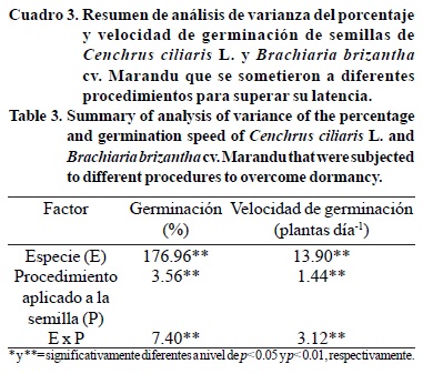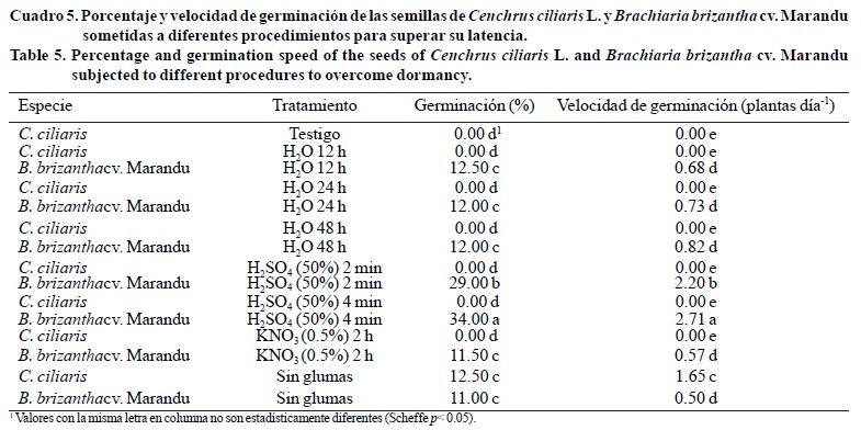 Las semillas de los pastos Cenchrus ciliaris L. y Brachiaria brizantha cv. Marandu presentan su máxima germinación entre seis y 18 meses después de cosechadas (Giarudo, 2003; Roig, 2004); sin embargo, los porcentajes son muy bajos (Sharif-Zadeh y Murdoch, 2000; Sallum et al., 2010), por lo tanto, es posible probar algunos procedimientos físicos, químicos y mecánicos a la semilla con la finalidad de superar este estado de reposo. En este sentido, Enríquez et al. (1999), mencionan que la inmersión de las semillas de pastos en agua durante períodos de 12 a 24 h permite el lavado de las sustancias que inhiben la germinación y se reinicie este proceso, constituyéndose este procedimiento como uno de los más prácticos y económicos para superar este fenómeno.