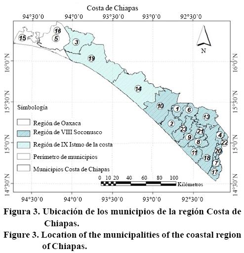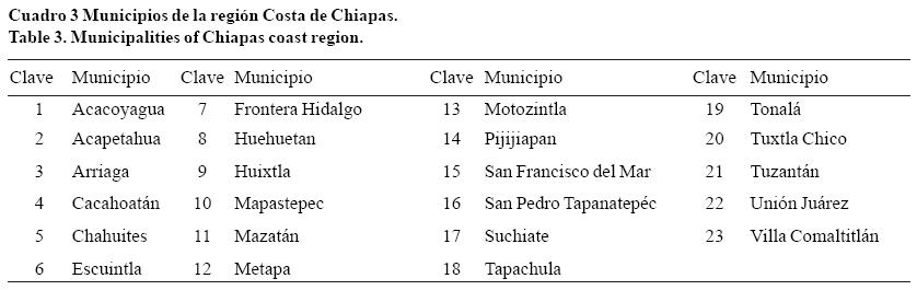 La localización de los municipios (Cuadro 3) pertenecientes a la región Soconusco e Istmo se presentan en la Figura 3.