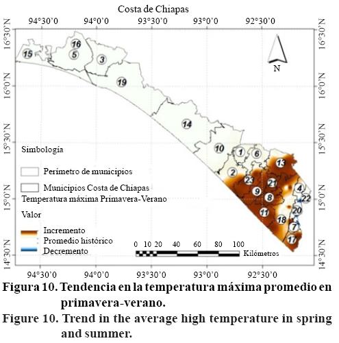 Se observó una tendencia en general de incremento a lo largo de toda la Costa de Chiapas (Figuras 8, 10 y 11), en la región Soconusco y en la serie de temperatura promedio en año agrícola son 17 estaciones; esto es 41% de las estaciones en esta región; sin embargo, se obtuvo un mayor número de estaciones con tendencia positiva para la serie de promedios en primavera-verano con 21 estaciones, representando 51% de las estaciones en la región. Las estaciones que presentaron éste incremento en la región Soconusco son Villa Comaltitlán (0.01 °C/año), Huehuetan (0.02 °C/año), Mazatán (0.01 °C/ año), Tapachula (0.03 °C/año) y Suchiate (0.02 °C/año). De la región Istmo se tiene Pijijiapan (0.01 °C/año) y Tonalá (0.01 °C/año). El municipio con una mayor tasa de incremento es Tapachula perteneciente a la región Soconusco. Es preciso poner atención a las zonas susceptibles de incremento pues en forma generalizada podría tener múltiples impactos sobre los sistemas productivos y ambientales de la región más aun en la agricultura ya que temperaturas ambientales superiores a las óptimas pueden disminuir la tasa fotosintética, incrementar las tasa respiratoria, acelerar el desarrollo y crecimiento de los cultivos y acortar la duración del ciclo fenológico (Lawlor, 2005). También puede tener impacto en el incremento en del consumo de agua por plantas y animales, la alteración de ciclos biológicos de diferentes organismos y cambios en la distribución ecológica.