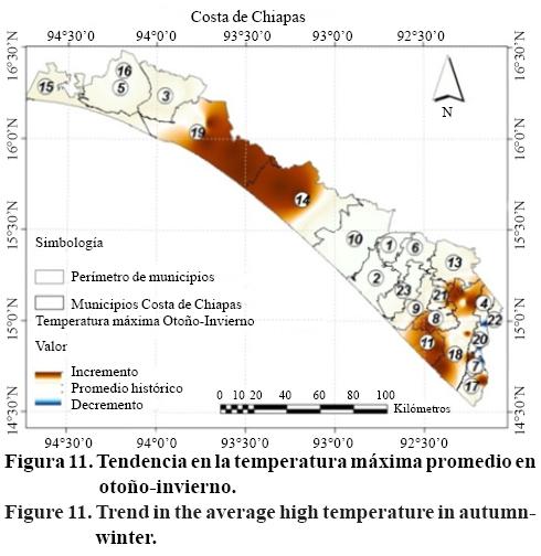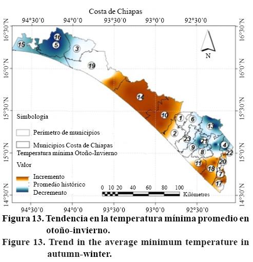 Las zonas que presentaron tendencia positiva son principalmente los municipios al sur de la región sur del Soconusco y la región Istmo. La tasa de incremento para los municipios en la región Soconusco son; Mapastepec (0.01 °C/año), Mazatán (0.02 °C/año), Tapachula (0.01 °C/año), Tuxtla Chico (0.01 °C/año) y Frontera Hidalgo (0.02 °C/año). De la región Istmo se tiene Tonalá (0.01 °C/año) y Pijijiapan (0.001 °C/año). Estos aumentos en las temperaturas de las noches, pueden incidir también negativamente, acelerando el metabolismo de las plantas, incrementando la tasa de respiración y finalmente ocasionando pérdidas en la calidad y productividad de diferentes cultivos (Alpi y Tognoni, 1991).