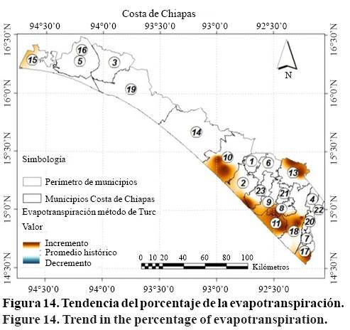 La evapotranspiración presentó tendencias positivas en la región Soconusco en general (Figura 14). Los resultados de la prueba de Mann-Kendall a las series de porcentajes de evapotranspiración indican que en la región Soconusco presentó incremento en 10 de 41 estaciones esto es 24%, por otra parte en la región Istmo presentó tendencia sólo 1 de las 10 estaciones por lo que se asume que en general no existe tendencia en el Istmo. La tasa anual de porcentaje de evapotranspiración de las estaciones del sur del Soconusco son: 7078 (0.16%), 7199 (0.15%), 7200 (0.11%), 7326 (0.30%), 7336 (0.70%), 7342 (0.90%), 7334 (0.40%). En el norte del Soconusco fueron 7333 (0.50%) y 7339 (0.30%). En la comparación de los periodos de 1960 -1985 y 19862010 se obtuvieron cambios importantes en el incremento del porcentaje de evapotranspiración: 7078(70% a 76%), 7199(30% a 36%), 7199 (47% a 50%), 7326 (50% a 56%), 7336 (50% a 69%), 7342 (33% a 60%), 7334 (49% a 61%), 7333 (40% a 55%) y 7339 (25% a 35%). En general el soconusco ha presentado incremento de la evapotranspiración lo cual causará déficit en la humedad del suelo y más aún sumado a la disminución de la precipitación, hará que sea necesario el suministro de una mayor cantidad de agua a los cultivos agrícolas por lo que se requerirá una buena administración del recurso por parte de la CONAGUA.
