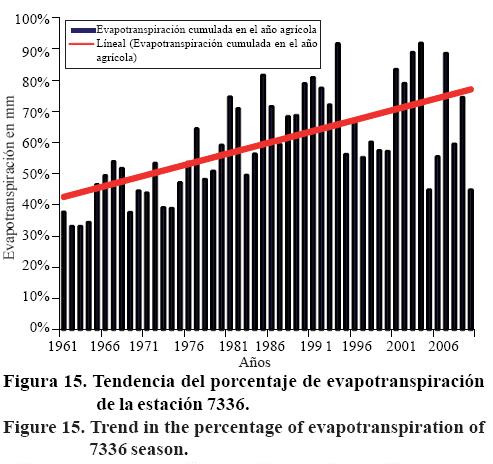 La evapotranspiración fue calculada mediante el método de Turc a partir de la temperatura media en el periodo del año agrícola y se evaluó mediante la prueba de Mann-Kendall para detectar tendencia (Figuras 14 y 15).