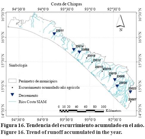 Los resultados de la prueba de Mann-Kendall en las series de escurrimientos acumulados en el año agrícola indican una fuerte correlación con las zonas susceptibles a tendencias identificadas en las variables climátieas. Ya que se observó que de las 12 estaciones hidrométricas (Figura 16) 6 presentaron tendencia negativa; 50% de las estaciones de la región Costa de Chiapas. La tasa de decremento en las estaciones con tendencia es la siguiente; estación 23011 (740 m3/año), 23014 (1 341 m3/año), 23009 (961 m3/año), 23008 (996 m3/año), 23020 (1 922 m3/año) y 23022 (962 m3/año). Ésta tendencia negativa en está relacionada directamente con la disminución de la lluvia y el aumento de la evapotranspiración. El impacto negativo de la disminución en el volumen escurrido incidirá directamente en la agricultura y en la ganadería, actividades económicas de las cuales dependen los habitantes de región.