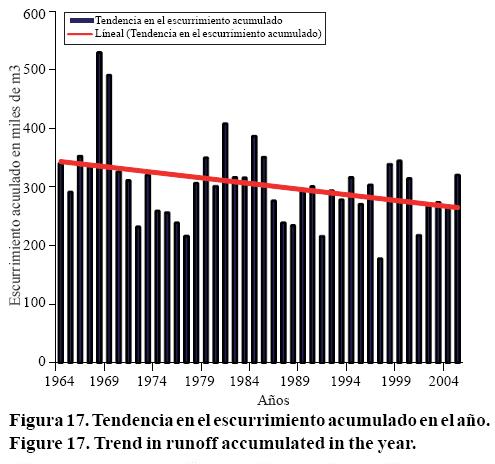 En una evaluación de la respuesta de la cuenca se ha analizado también las series de escurrimientos acumulados en el año agrícola (Figuras 16 y 17) mediante la prueba de Mann-Kendall.