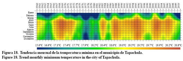 En el análisis local se evaluó la evolución grafica de las temperaturas mínima y máxima (Figura 18 y 19) en el municipio de Tapachula. El promedio mensual del municipio se obtuvo mediante la aportación del área de influencia de cada estación de acuerdo a los polígonos de Thiessen.