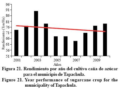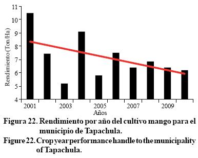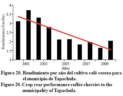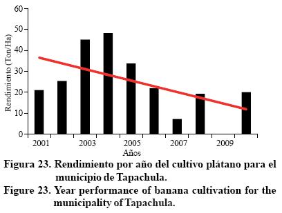 El incremento de la temperatura mínima y máxima puede incidir directamente en la agricultura (Sánchez et al, 2012), éstas consecuencias se están haciendo notar pues el rendimiento de los cultivos se ve afectado, pues en el municipio de Tapachula se observa una tendencia negativa en el rendimiento por año de los cultivos por temporal de café cereza, caña de azúcar, mango y de plátano (Figuras 20 a 23) (21, 22), con ello se deberá optar por semillas mejoradas ante eficiencias hídricas (Castañeda y Muños, 1987; Arredondo y Aragón, 1997; Pérez et al., 1999; Reyes et al., 2000).