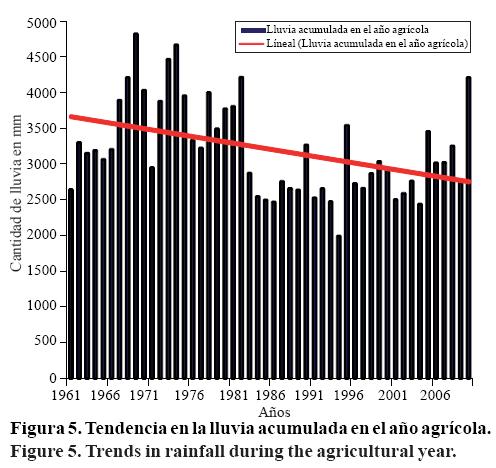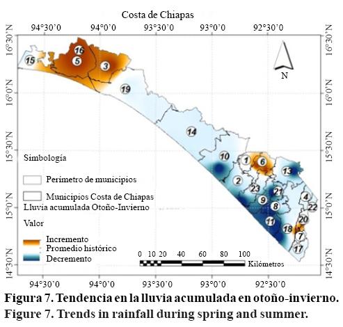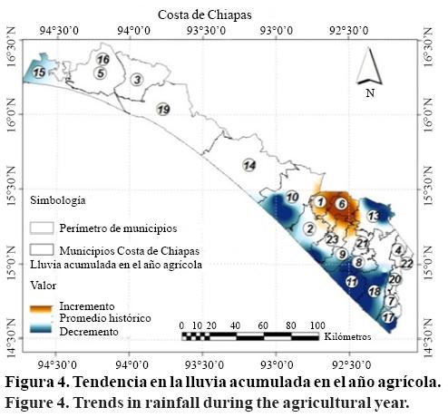De la serie de acumulados de lluvia en el año agrícola se determinó que 12 de las 51 estaciones presentan decremento, la región que presenta una tendencia generalizada es el Soconusco (Figura 4) ya que 11 de 41 estaciones presentan decremento. Los municipios y sus respectivas tasas de decremento anual donde están ubicadas estas estaciones son Mapastepec (14 mm/año), Acapetahua (25 mm/año), Huehuetan (16 mm/año), Mazatán (20 mm/año), Tapachula (2mm/año) y Suchiate (2 mm/año).