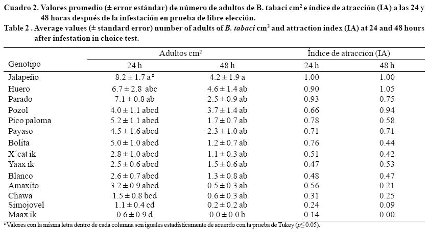 En la segunda evaluación, 48 h después de la infestación, en general se encontró menor atracción de adultos a los genotipos, con respecto a la primera evaluación. Los valores variaron de 0 a 4.6 adultos por cm2 (Cuadro 2). Se observó en el genotipo Maax ik significativamente menor atracción de adultos que en el genotipo Jalapeño. En el caso de los índices de atracción se registraron valores que oscilaron de 0 a 1 adultos cm2. El índice de atracción para el genotipo Maax ik fue 0. Tomando en cuenta ambas evaluaciones (24 y 48 h postinfestación) y el cálculo de los índices de atracción, el genotipo que presentó menor atracción de moscas blancas adultas fue Maax ik (Cuadro 2).