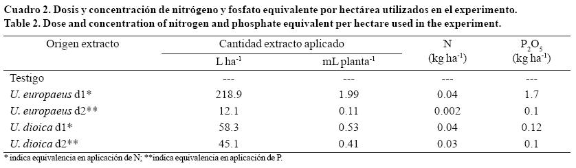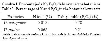 Los extractos vegetales se prepararon. a) en base de tallos jóvenes de U. europaeus de entre 15 cm y 60 cm de longitud, sin flores y con espinas; y b) en base a brotes y hojas de U. dioica en estado de floración. Para la obtención de los extractos acuosos totales se procedió a triturar el material vegetal con un mortero de cerámica y una picadora eléctrica de uso doméstico marca Oster, posteriormente se llevo a una solución en proporción 1:10 de material fresco triturado y agua destilada respectivamente, y almacenaron en oscuridad a 4 °C ±1 °C por 7 días (Pacheco et al, 2004). Posteriormente, se filtró con una bomba de vacío (Welch 1399 Duoseal Vacuum Pump) y papel filtro Whatman N°2. Se determinó el contenido de N y P2O5 de los extractos utilizando el método Kjeldahl y Nitro-vanado-molibdato, respectivamente (Cuadro 1).