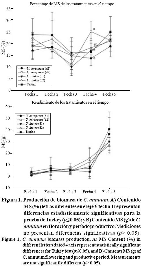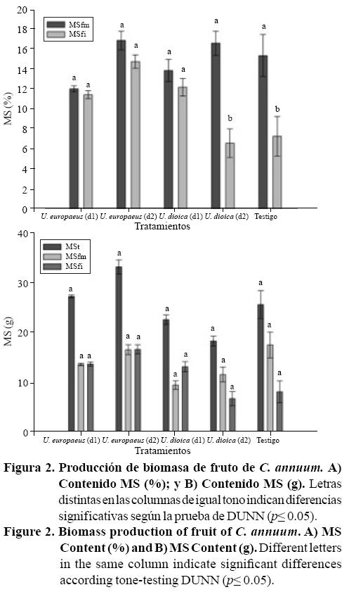 Los extractos acuosos de U. europaeus y U. dioica, en las dosis evaluadas, generan efectos en la concentración de la producción de biomasa y concentración de polifenoles, siendo la dosis d2 de U. europaeus la de mayor efecto, por lo tanto, es factible la utilización de estos extractos en el cultivo de C. annuum, al mejorar calidad funcional de éste.