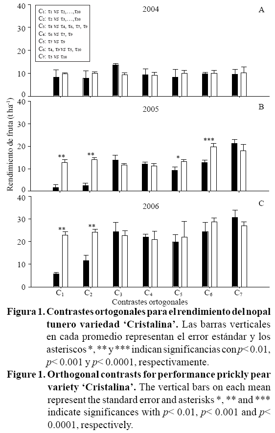 El análisis de la información no detectó diferencias entre tratamientos para el ciclo de evaluación de 2004, la falta de rechazo de las hipótesis nulas para los siete contrastes ortogonales plantados confirmó la igualdad promedio entre tratamientos (Cuadro 1; Figura 1A). En la evaluación de 2005, la hipótesis nula para el primer y segundo contraste indicó, en promedio, que el efecto de la adición de NPK incrementó el rendimiento de la fruta en comparación con las plantas testigo (sin fertilizante) o en aquellas fertilizadas solamente con P y K, respectivamente (Cuadro 1; Figura 1B); ambas hipótesis fueron consistentes para la evaluación 2006 (Cuadro 1; Figura 1C).