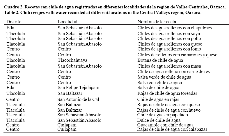 Praxis. Se describieron cuatro usos principales para el fruto del chile de agua: 45% de los entrevistados lo aprecia como comestible (Figura 1). Se recopilaron 20 recetas (Cuadro 2), El chile de agua relleno con masa de maíz es una receta representativa de San Sebastián Abasolo, Tlacolula, la cual consiste en una serie de paso sencillos pero precisos. Según García (1991) y Bañuelos et al. (2008), la mayoría de los productos alimenticios prehispánicos persisten todavía. La receta del postre de chile de agua, indica la versatilidad del fruto, ya que además de ser usado para elaborar platillos pungentes también se pueden preparar comidas dulces, coincidiendo con el Chef Álvarez (2011) en Hernández (2011) con su receta de esquimo de chile ancho, con García (1991) y Long (2011) que el chile enriqueció de golpe la cocina entera, su necesidad culinaria trascendió a la cocina por que da a cualquier guiso o preparado el toque excitante y cálido, que lo hace más apetecible, sabroso y cabal, excitando tanto el paladar como a la vista; Long-Solis (1986) argumenta que en el caso específico de los chiles de gusto locales, muchas veces son los que dan el toque significativo a la comida.