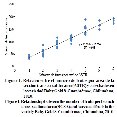 El coeficiente de determinación para la relación entre el número de frutos por área de la sección transversal de rama y producción (kg) de fruta por rama fue 81% y con base en una prueba de Ji cuadrada para bondad de ajuste entre valores observados y estimados con el modelo generado se determinó ajuste significativo con 95% de confianza.