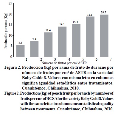 Con los resultados antes indicados se logró establecer una relación no lineal entre el número de frutos por cm2 deASTR y producción en kg de durazno por rama (Figura 3) de la siguiente forma: