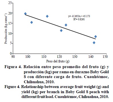 Se detectó relación negativa entre peso promedio del fruto (g) y rendimiento por rama (kg), donde se observó que a medida que el rendimiento aumenta, el peso del fruto disminuye y estuvo en función de la carga del fruto establecida como tratamiento, donde los tratamientos 1 y 2 frutos por cm2 de ASTR presentaron los frutos de mayor peso con 143 y 142 g respectivamente, y con 7 frutos por cm2 deASTR se obtuvieron frutos de menor tamaño con 98 g (Figura 4). Esta información permite señalar que mediante el raleo se puede ajustar la carga para producir el tamaño del fruto que el mercado requiere y poder programar los calibres de mayor demanda y por lo tanto con mejor precio (Reighard et al., 2006).