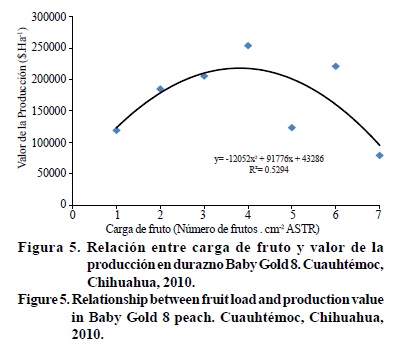 El valor de la producción en durazno de diferentes calibres indica que cuando se ralea dejando entre 4 y 6 frutos por cm2 de ASTR es donde se obtiene balance entre producción y tamaño de fruto para lograr mejores retornos (Figura 5). Sin embargo, se observa que con 5 frutos por cm2 de ASTR se obtiene menor valor de la producción, esto podría atribuirse a error de muestreo, ya que la tendencia, aplicando la ecuación de la Figura 3, indica que con 5 frutos el valor por ha es de 200 880.00 pesos. Esta información indica que mediante raleo, se puede programar el tamaño del fruto a cosechar y por lo tanto estimar el valor de la producción con base en los precios en el mercado, dependiendo del tamaño (Stover et al., 2001; Reginato et al, 2007; Ojer et al, 2009).