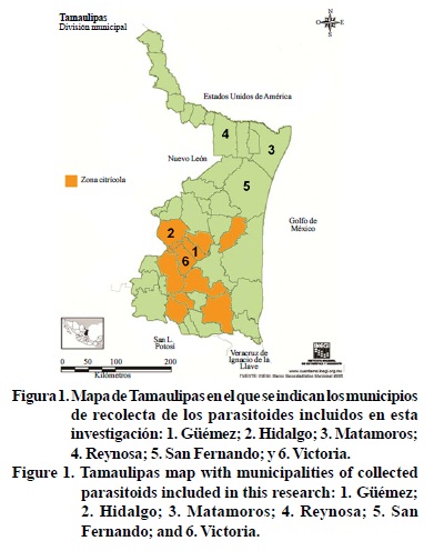 Los parasitoides utilizados durante la presente investigación provienen de recolectas de campo realizadas entre los meses de febrero-noviembre de los años 2006-2012 y primer semestre de 2013 en la zona citrícola del estado de Tamaulipas, así como plantas rutáceas del área urbana de Cd. Victoria, y Matamoros (Cuadro 1). Los especímenes se capturaron mediante red de golpeo y algunos se obtuvieron a partir de brotes infestados con ninfas de D. citri de tercer a quinto instar, parasitadas y mantenidas en cajas Petri de plástico a temperatura ambiente. Este material fue revisado diariamente durante dos semanas; los parasitoides emergidos se recolectaron con aspirador bucal y se conservaron en alcohol al 96%. Se seleccionó un total de 56 ejemplares distribuidos en los municipios de Güémez (recolectas del año 2006), Hidalgo (2006, 2007, 2011), Matamoros (2013), Reynosa (2013), San Fernando (2013) y Victoria (2007, 2008, 2010) (Figura 1), a partir de los cuales se aisló su ADN de manera individual y posteriormente se amplificó, se envió a secuenciar y se determinó a que haplotipo pertenecen.
