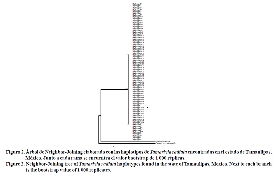 Se identificaron dos haplotipos los cuales corresponden a transiciones y transversiones (Cuadro 2), cada uno con una distancia genética de 0.112 diferencias por sitio en comparación con la especie hermana T. triozae, mientras que la distancia genética entre los haplotipos 1 y 2 fue de 0.005 (diferencias por sitio). La distancia genética que existe entre los haplotipos de T. radiata se observa reflejada en el árbol filogenético (Cuadro 3), la cual permite la separación de los haplotipos en ramas distintas. En el árbol se distinguen con números las muestras provenientes de Güémez (#2, 3, 21, 22, 55, 56), Hidalgo (#1, 4-6, 11-14, 38-47), Matamoros (#28-32, 35-37), Reynosa (#34, 48), San Fernando (#33) y Victoria (#7-10, 15-19, 23-27, 49-54) (Figura 2).