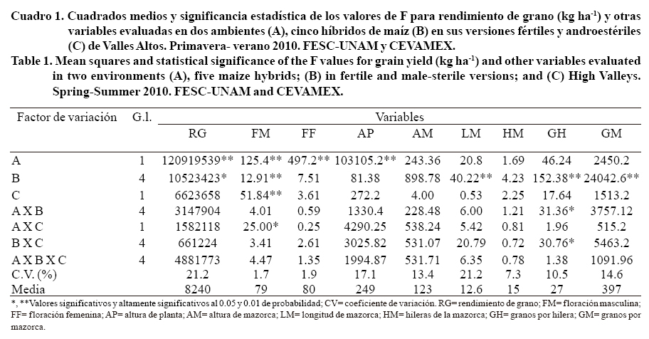 Para floración femenina y altura de planta hubo diferencias altamente significativas (p≥ 0.01) entre ambientes (A), en las otras variables no se presentó significancia. En altura de mazorca, en ninguna variable se detectó significancia estadística. En longitud de mazorca, granos por hilera y granos por mazorca hubo diferencias altamente significativas para el factor de variación híbridos. Para la variable granos por mazorca las diferencias se observaron al nivel de 5%, para la interacción ambiente x androesterilidad/fertilidad (AxC) y para la interacción híbridos x androesterilidad/fertilidad (BxC), (Cuadro 1).