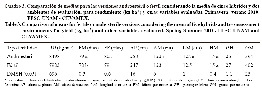 La comparación de medias para rendimiento de grano mostró que la versión androestéril presentó una producción estadísticamente similar a la fértil (Cuadro 3). El resultado anterior es explicable ya que las versiones androestériles son isogénicas de las fértiles; sólo difieren en la producción o no de granos de polen, como se señala en diversos trabajos (Martínez et al., 2005; Ramírez, 2006; Tadeo et al., 2007). No obstante, éstos resultados contrastan lo anterior con los observados en otros estudios, donde se ha encontrado que las versiones androestériles alcanzan rendimientos estadísticamente superiores al de las fértiles (Martínez et al., 2005; Tadeo et al., 2007). La comparación de medias para floración masculina definió que la versión androestéril es más tardía, con respecto a la versión fértil, en cambio para las demás variables: floración femenina, altura de planta y mazorca, longitud de mazorca, hileras por mazorca, granos por hilera, granos por mazorca, señala que no hubo diferencias significativas entre las versiones androestéril y fértil, situación atribuible al hecho, como se indicó previamente, de que son genéticamente similares, excepto para los genes génico-citoplásmicos relacionados con la esterilidad masculina tipo C, que causan que en la versión androestéril no haya producción de polen, mientras que en la fértil si (Tadeo et al., 2007; Tadeo et al., 2010).