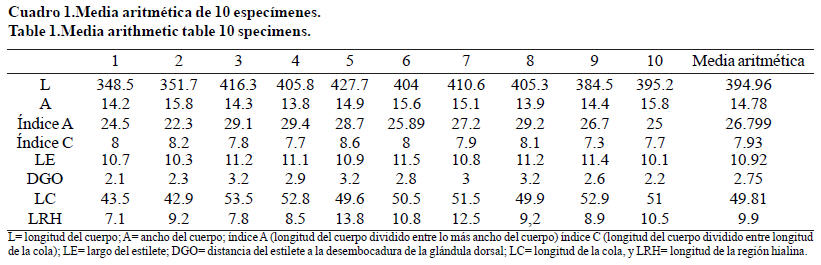 Posteriormente se realizó el análisis morfométrico de 10 especímenes de juveniles del segundo estadío, obteniendo el promedio de cada carácter medido. Se realizaron montajes de juveniles y se observaron al microscopio compuesto marca Labomed con cámara Digi 2 1500 de 10 a 100 x, midiendo mediante un software Digi Pro 4.0 diferentes índices de DeMan (1880) para la identificación de juveniles.