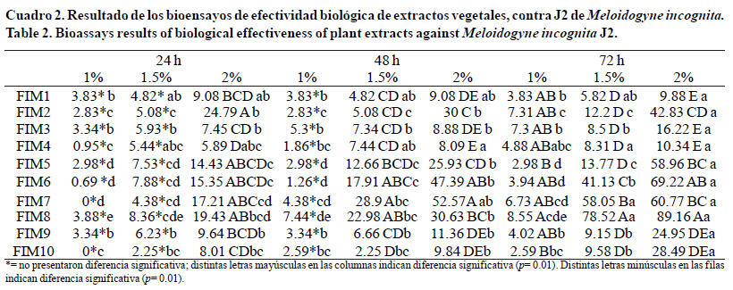 Los diferentes extractos evaluados, mostraron efectos en la mortalidad del nematodo agallador Meloidogyne incognita, siendo la concentración de 2% y a las 72 h de exposición, la que presentó mayor porcentaje de mortalidad. El extracto FIM8 (Ruezno acuoso), obtuvo el mayor porcentaje de mortalidad con 89.16%, seguido por el FIM6 (Ruezno etanolítico) con 69.22%, y el FIM7 (cáscara acuoso) con 60.77% esto a las 72 h de exposición con los extractos.