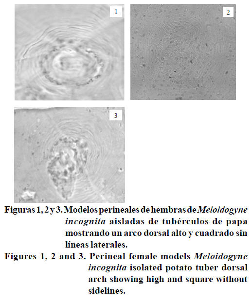 De acuerdo a los modelos perineales de las hembras adultas y las claves taxonómicas de identificación de Eisenback (1981), se determinó que el nematodo corresponde a Meloidogyne incognita, ya que presentaron un arco dorsal alto y cuadrado formado por estrías, algunas onduladas, sin líneas laterales (Figuras 1, 2 y 3).