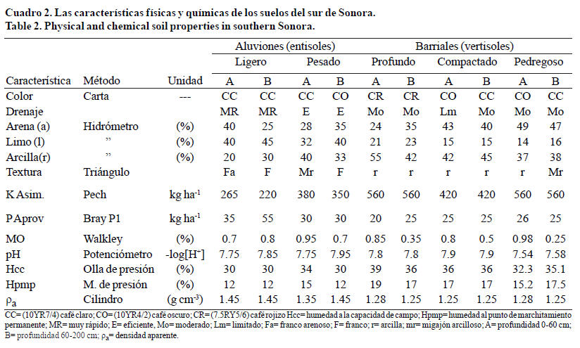 El análisis físico y químico de los horizontes detectados, se presenta en el Cuadro 2. Esta información indica que en el área existen dos condiciones de producción, una nominada como los suelos de barrial, arcillosos, de color café obscuro, a café rojizo, cuya característica central es que forman grietas cuando se secan, que pueden llegar a profundidades mayores de dos metros. La otra categoría es la de los suelos de aluvión, cuya característica central es que después del riego o una lluvia fuerte forman costras relativamente gruesas (hasta de 5 cm) una vez que se secan, lo cual condiciona su manejo agronómico.
