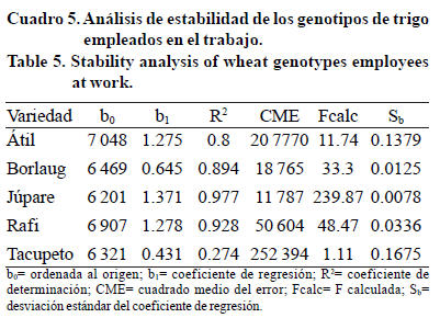 El análisis de estabilidad (Cuadro 5) usando el modelo de Eberhart y Russel (1966), indicó que la mayor estabilidad se logró en este trabajo con los genotipos Júpare, Rafi y Átil con coeficientes de regresión de 1.4, 1.3 y 1.3 respectivamente, cuya tendencia general es de respuesta adecuada al incremento en el índice ambiental. El resto de los genotipos (Tacupeto y Borlaug), resultaron a juzgar por su coeficiente de regresión (0.431 y 0.645), con baja respuesta a la intensidad del ambiente, lo que significa que son de comportamiento atractivo, para terrenos con baja productividad natural.