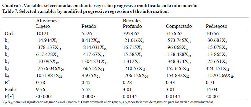Con esta misma información, se corrió también un análisis de regresión progresiva modificada (Stepwise), para seleccionar el mejor conjunto de variables para un nivel de probabilidad que se elige a priori. Las ecuaciones seleccionadas mediante esta técnica, se presentan en el Cuadro 7. En todos los casos se agregó los cuadráticos y las interacciones, pero la aportación a la R2 fue en ocasiones negativa, motivo por el cual se usan los modelos lineales.
