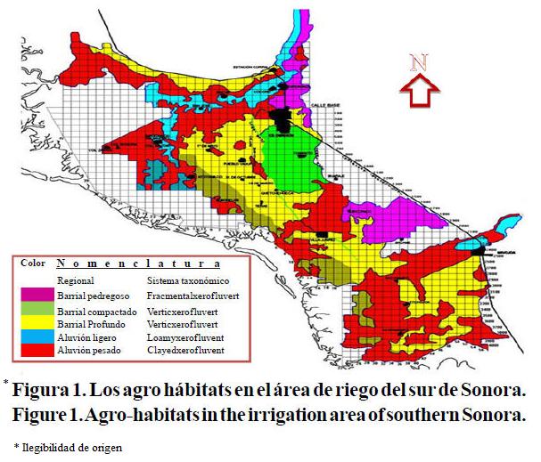 Desde el punto de vista de su fisiografía, el sur de Sonora, puede dividirse en dos grandes regiones: El área de riego en la Figura 1 y el área de temporal. Nuestra publicación se refiere al área de riego, donde se colecto información mediante encuestas de 236 parcelas de productores cooperantes, 52 en el Delta del Río Mayo, 23 en las comunidades Indígenas Yaquis y el resto en la margen derecha del delta del Río Yaqui. La región es sumamente plana, los problemas que existían en los meandros abandonados de los ríos, fueron subsanados mediante la nivelación en 95%. La caída natural es de 1.5 a 2 metros al millar en dirección noreste suroeste, con dirección al mar. Por el hecho de ser una región tan plana, la climatología es prácticamente constante y en definitiva tendrá poca influencia en la productividad de éstas 236 parcelas.