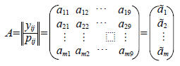 El i-ésimo vector hilera de la matriz A representa el vector de ingresos per cápita del estado i correspondiente a cada una de sus nueve actividades económicas: ãi= (ai1, ai2,..., ai9).