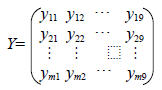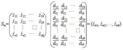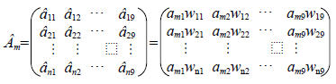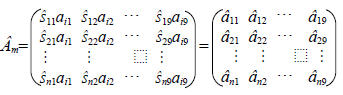 Cada uno de los elementos de cada una de las hileras de esta matriz se multiplica por el componente correspondiente del vector: ãm= (am1, am2,..., am9), de ingresos per cápita del estado i correspondiente a cada una de sus nueve actividades económicas, dando como resultado la matriz: Â= ||âij||, (n * 9):