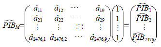 Esta matriz representa el producto interno bruto estimado de cada una de las actividades económicas, y para cada municipio del país. La suma por columnas de la matriz Âi produce el vector hilera: âm= (âm1, âm2,..., âm9), que es el vector de ingresos per cápita estimados y preliminares del estado i correspondiente a cada una de sus nueve actividades económicas. Es muy probable que el vector de estimadores: âm= (âm1, âm2,..., âm9) resulte distinto del vector observado de ingresos per cápita del estado i correspondiente a cada una de sus nueve actividades económicas; es decir, puede ser que: âm - âm = (âm1, âm2,..., âm9) - (âm1, âm2,..., âm9) ≠ 0 En este caso, se deben calibrar cada una de las matrices: Âm= ||âij||, (n * 9), con el fin de obtener un nuevo vector consistente con la información estadística de estimadores del ingresos per cápita del estado i correspondiente a cada una de sus nueve actividades económicas, y también para obtener, finalmente, las matrices consistentes del producto interno bruto municipal, en total y por actividad económica.