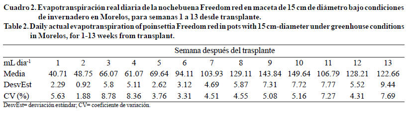 La evapotranspiración real o requerimiento de riego dentro del invernadero para nochebuena 'Freedom Red' en macetas de diámetro 15 cm, a nivel semanal es de 40 mL día-1 (equivalente a 0.24 mm día-1) en la semana 1 DDT con aumento gradual hasta alcanzar 150 mL día-1 (equivalentes a 0.9 mm día-1) en la semana 10 DDT. La evapotranspiración real para nochebuena dentro del invernadero no se puede obtener usando el método de Penman-Monteith, a partir de datos climáticos fuera del invernadero.