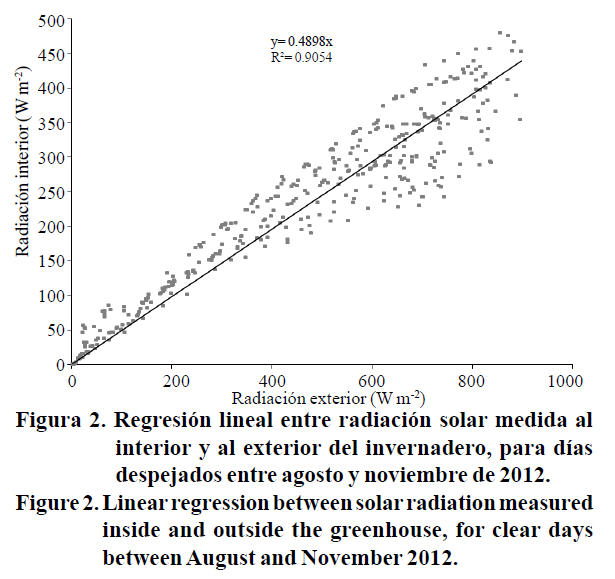Previo al cálculo de la evapotranspiración de referencia se calculó la transmisividad del plástico del invernadero, mostrando que la radiación solar diaria recibida dentro del invernadero fue en promedio 51% más baja, que la medida afuera del invernadero para el periodo evaluado. La regresión lineal entre radiación solar medida al interior y al exterior del invernadero para todos los días despejados en el periodo de estudio (menos de 10% del total), con base en los datos de cada 15 min, se muestra en la Figura 2, indicando una transmisividad promedio del material de polietileno del invernadero de 49% aproximadamente, originada por el deterioro y el tipo de plástico utilizado, y el ángulo de incidencia de los rayos solares (Soriano et al., 2002). Cabe mencionar, que no se consideraron los datos tomados durante las noches.