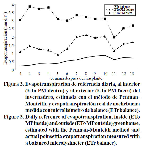 La Figura 3 muestra la variación temporal de la evapotranspiración de referencia (ETo) promedio diaria calculada con el método de Penman-Monteith, correspondiente al periodo de 21 agosto al 15 de noviembre de 2012 (semanas (S) 1 a 13 DDT), para condiciones dentro (ETo PM dentro) y fuera (ETo PM fuera) del invernadero, así como la evapotranspiración real medida con microlisímetro de balance (ETr balance) dentro del invernadero. Para todo el periodo del estudio, la ETr balance fue más baja que la ETo PM dentro del invernadero y ésta diferencia disminuyó casi continuamente. Se aprecia que numéricamente, en el experimento, los valores de ETo PM dentro y ETr balance se mantuvieron inferiores a los reportados por Baille et al. (1994) de 2 mm día-1 para un IAF menor o igual a 2, producto del IAF de 1.06 m2 m-2 reportado al fin de la prueba (Cuadro 1). Los menores valores de ETo PM Dentro con respecto a ETo PM Fuera del invernadero, corresponde con los autores revisados para diferentes ambientes por Fernandes et al. (2003) y su misma investigación, a nivel semanal y durante 13 semanas.