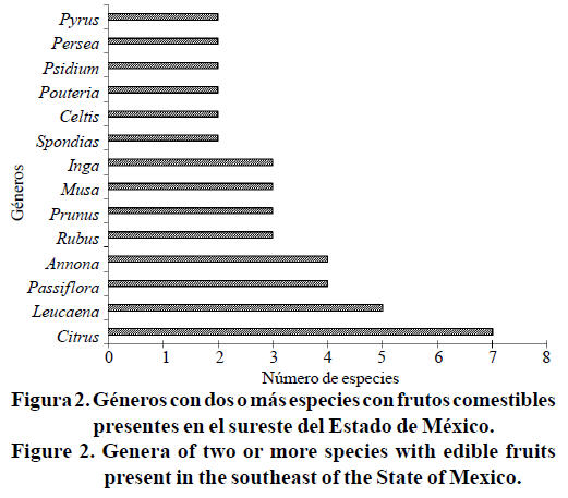 El género predominante fue Citrus (Rutaceae) con siete especies, seguido por Leucaena con cinco, y Annona y Passiflora con cuatro (Figura 2); 75.4% de los géneros están representados por sólo una especie. En el contexto anterior, resultados similares fueron obtenidos para Michoacán (Segura et al., 2009) y Yucatán (García, 2000), y estos hechos podrían atribuirse a que éste es un género que agrupa a 162 especies comestibles (Mabberley, 1997) que prosperan en clima tropical y subtropical, características que le confieren mayor adaptabilidad en los diferentes países donde ha sido introducido exitosamente.