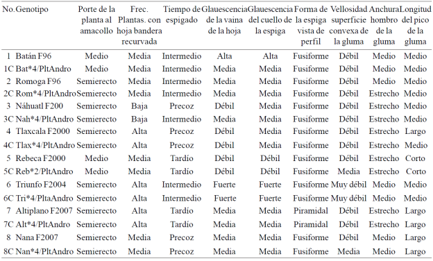 Se utilizaron ocho variedades como progenitores recurrentes para incorporarles la fuente de esterilidad a través de 4 retrocruzas; las siembras se realizaron en primavera- verano, 2005, otoño- invierno, 2005- 2006, primavera- verano, 2006 y otoño- invierno, 2006-2007 en el CEVAMEX; inicialmente se recombinó cada variedad con cinco espigas estériles (F1); la semilla obtenida se sembró y las plantas estériles se retrocruzaron con su respectiva variedad, para obtener de la retrocruza uno la semilla F1 (F1RC1); este procedimiento se repitió para lograr las F1RC2, F1RC3 y F1RC4. La semilla obtenida de la última retrocruza se incrementó para realizar en el CEVAMEX (primavera- verano, 2010) la descripción fenotípica entre las variedades y su conversión, para valorar la eficiencia de la reconversión, en base a 10 descriptores varietales manejados por la UPOV.