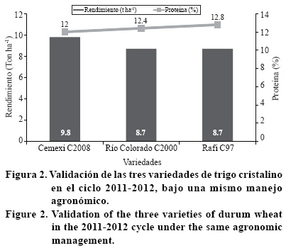 Sin embargo, el contenido de proteína en grano a 12% de humedad fue 12%, inferior al de las variedades Río Colorado C2009 y Rafi C97, el grano mostró contenido de proteína de 12.4 y 12.8%, respectivamente (Figura 2). Respecto a la intensidad del color amarillo de la semolina, el valor b de Minolta para Cemexi C2008 fue de 30.45, superior al obtenido por Río Colorado C2000 (27.38) y Rafi C97 (26.11).
