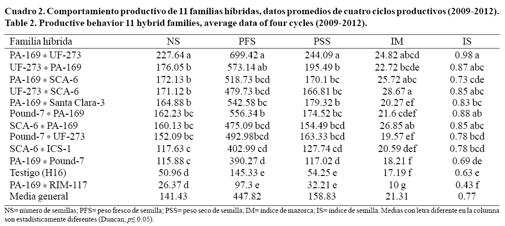 En el Cuadro 2, se muestran los resultados de variables del comportamiento de 11 familias híbridas y el testigo. En el análisis de varianza fueron significativas (p≤ 0.05) las variables número de semillas, peso fresco y seco de semilla así como los índices de mazorca y semilla, respectivamente. En la variable de número de semillas, los resultados obtenidos proyectaron rangos de 26.37 a 227.64 siendo la familia híbrida PA-169 * UF-273 quien obtuvo el valor más alto, seguido por las familias UF-273 * PA 169 y PA-169 * SCA-6. El promedio de peso fresco de semillas fue de 447.82 el cual fue ampliamente superado por las familias UF-273 * PA-169 y PA-169 * UF-273, quienes obtuvieron valores de 573.14 y 699.42 g planta respectivamente. El peso seco de semillas varió de 32.21 a 244.09 g planta. Destacan los híbridos UF-273 * PA-169 y UF-273 * PA-169 con valores de 195.49 y 244.09 g planta, respectivamente, promedio de cuatro ciclos de evaluación.