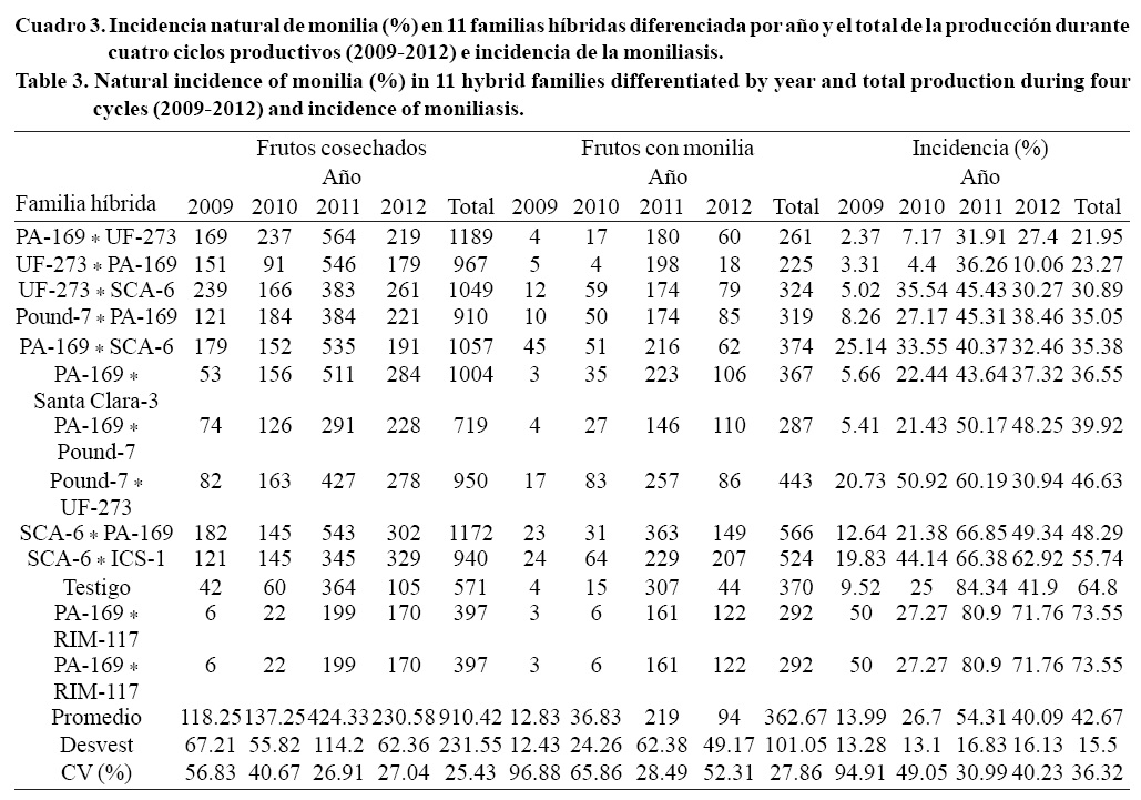 En el Cuadro 3, se presenta la incidencia natural de monilia (%) diferenciada por año y el total de los cuatros años, observándose el incremento del promedio a través de los años. La mayor incidencia la mostró el cruzamiento PA-169 * RIM-117 con 73.55% y la menor los cruzamientos recíprocos PA-169 * UF-273 y UF-273 * PA-169 con incidencias menores a 25%. Resultados similares fueron reportados por Pérez (2009), en los clones CATIE R-129 (UF-273 * PA-169) y CATIE R-127 (UF273 * PA-169). Considerando el promedio total de mazorcas cosechadas en el ensayo, la plantación presentó 42.67% de incidencia de moniliasis. En el total de los híbridos se presentó la incidencia natural de la enfermedad. Los híbridos con incidencia menor a 25% tienen como progenitores a los clones resistentes PA-169 y UF-273 tanto como progenitor femenino y masculino, mientras que los híbridos con incidencia de más de 25% provienen de los cruzamientos con los clones SCA-6, ICS-1, RIM-117 y POUND-7. Arciniegas y Phillips (2006), observaron un comportamiento similar en los genotipos UF-273 y PA-169 de un total de 98 genotipos (entre clones e híbridos) evaluados.